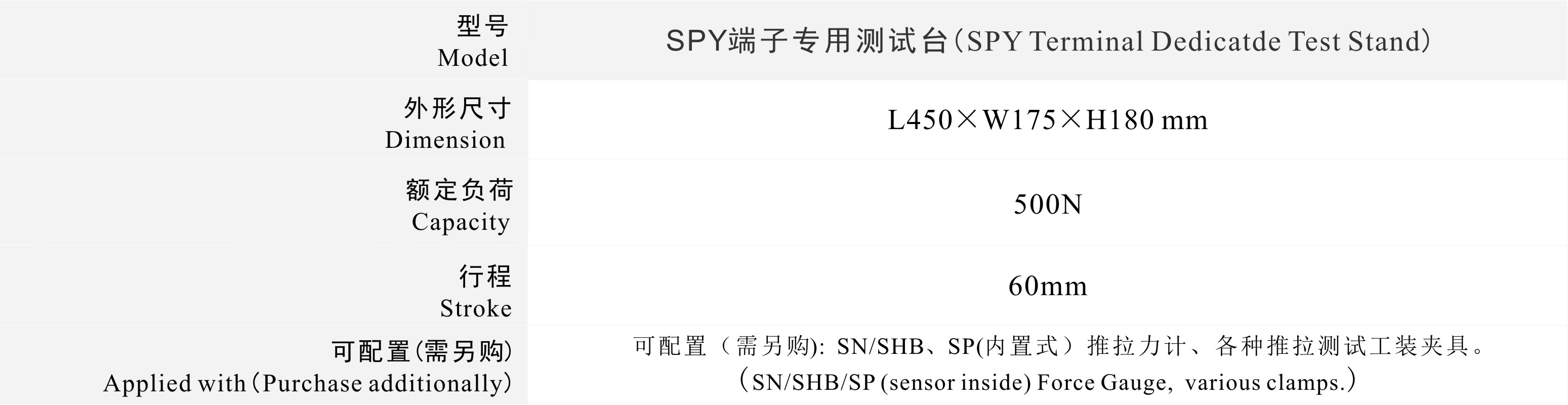 可配置(需另購):SN/SHB、SP(內(nèi)置式)推拉力計、各種推拉測試工裝夾具。